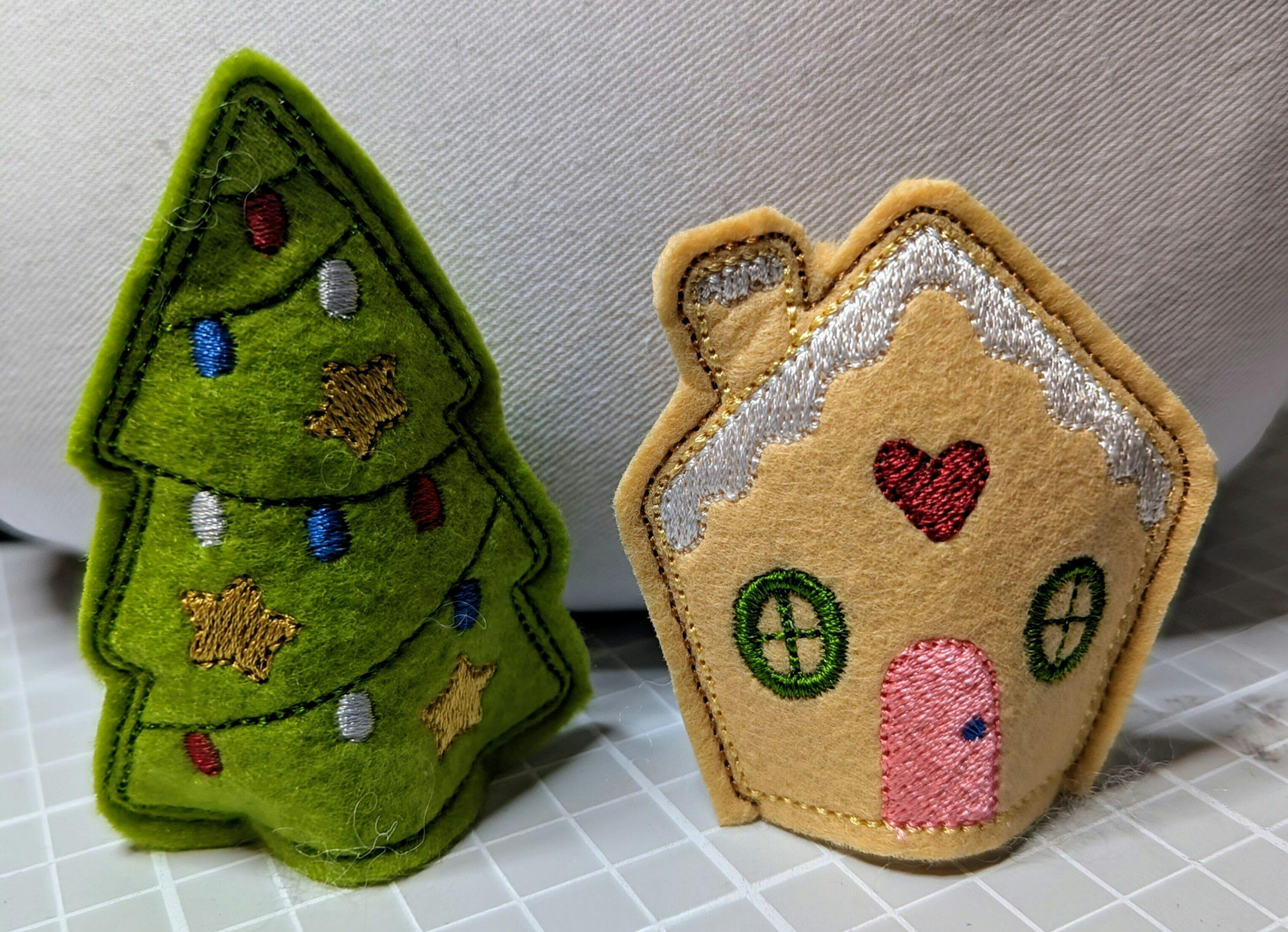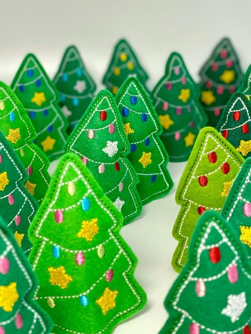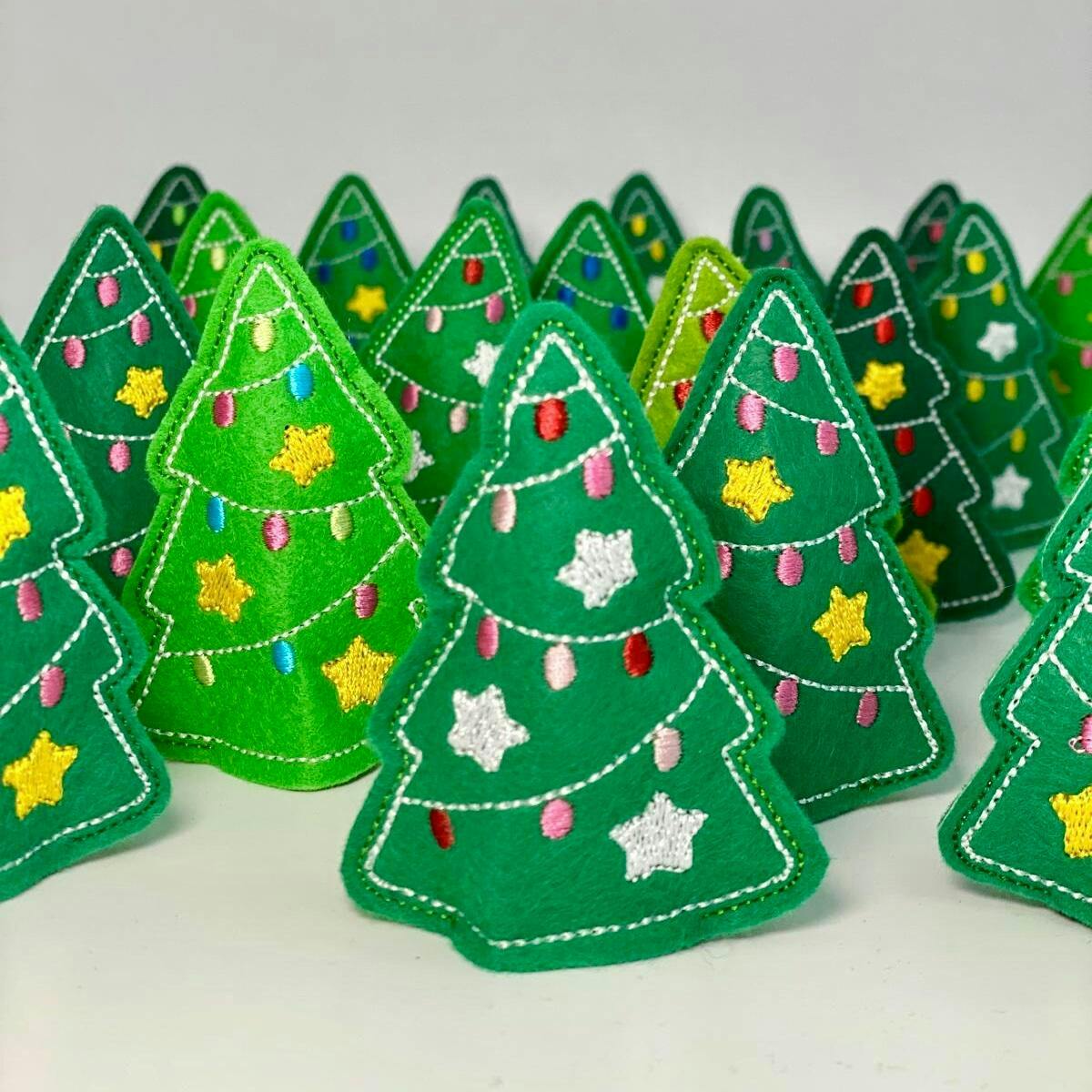 Der Weihnachtsbaum wird komplett in-the-hoop (ITH) gestickt: Zuerst wird die Vorderseite mit hübschen Stickdetails versehen, dann die Rückseite aufgestickt und zum Schluss einfach ausgeschnitten. Schon ist dein kleiner Baum fertig zum Befüllen.