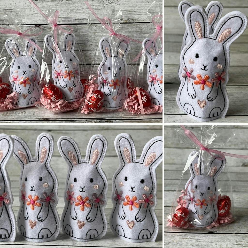 Der Stickdatei Hase mit Schokoladenei-Versteck ist das ideale Ostergeschenk! Aus weichem Filz gefertigt, enthält er eine Tasche, in der ein kleines Schokoladenei Platz findet. So steht er stabil und wird zum süßen Blickfang auf dem Osterbuffet oder als liebevolles Mitbringsel.