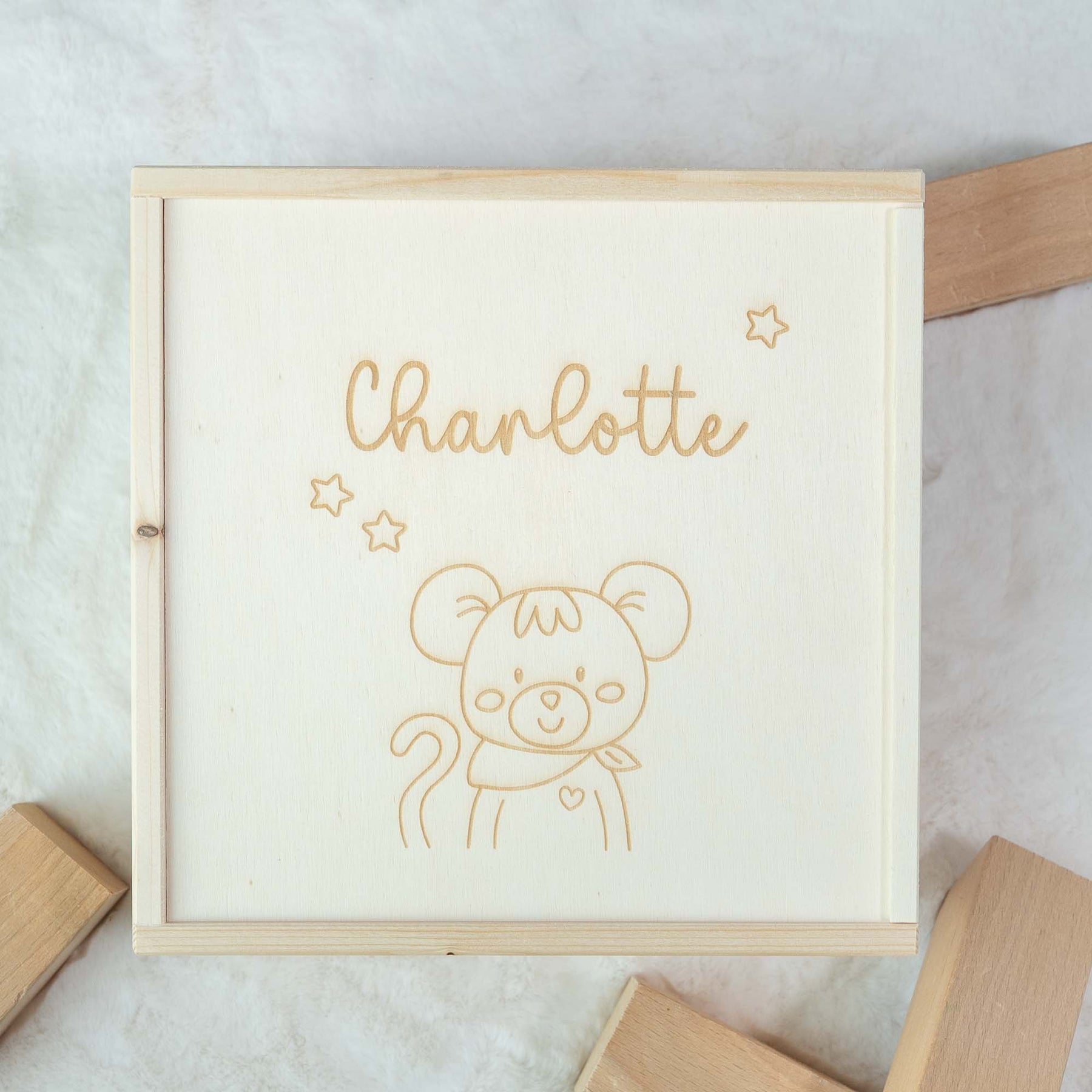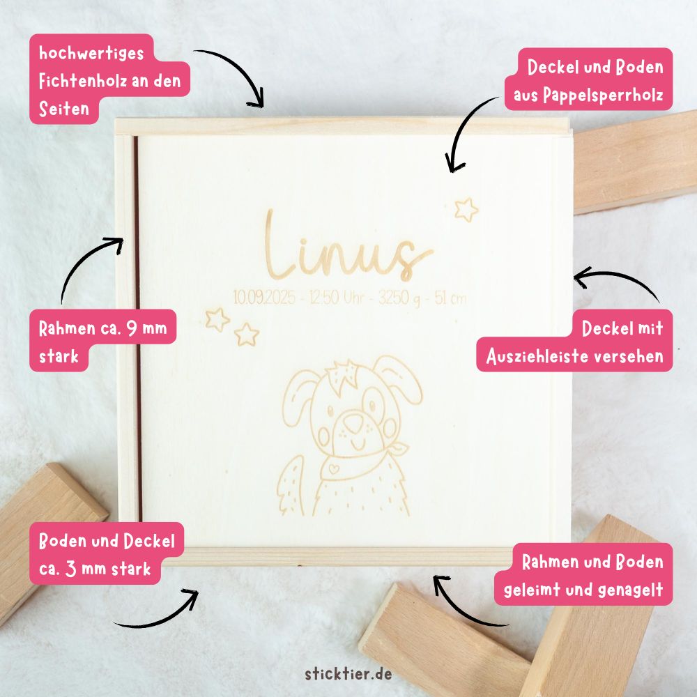 Unsere personalisierte Holz-Geschenkbox ist die perfekte Verpackung für kleine Schätze, Kuscheltiere, Erinnerungen oder handgemachte Geschenke. Jede Box wird von mir mit viel Sorgfalt belasert und erhält den individuellen Wunschnamen auf der Vorderseite.